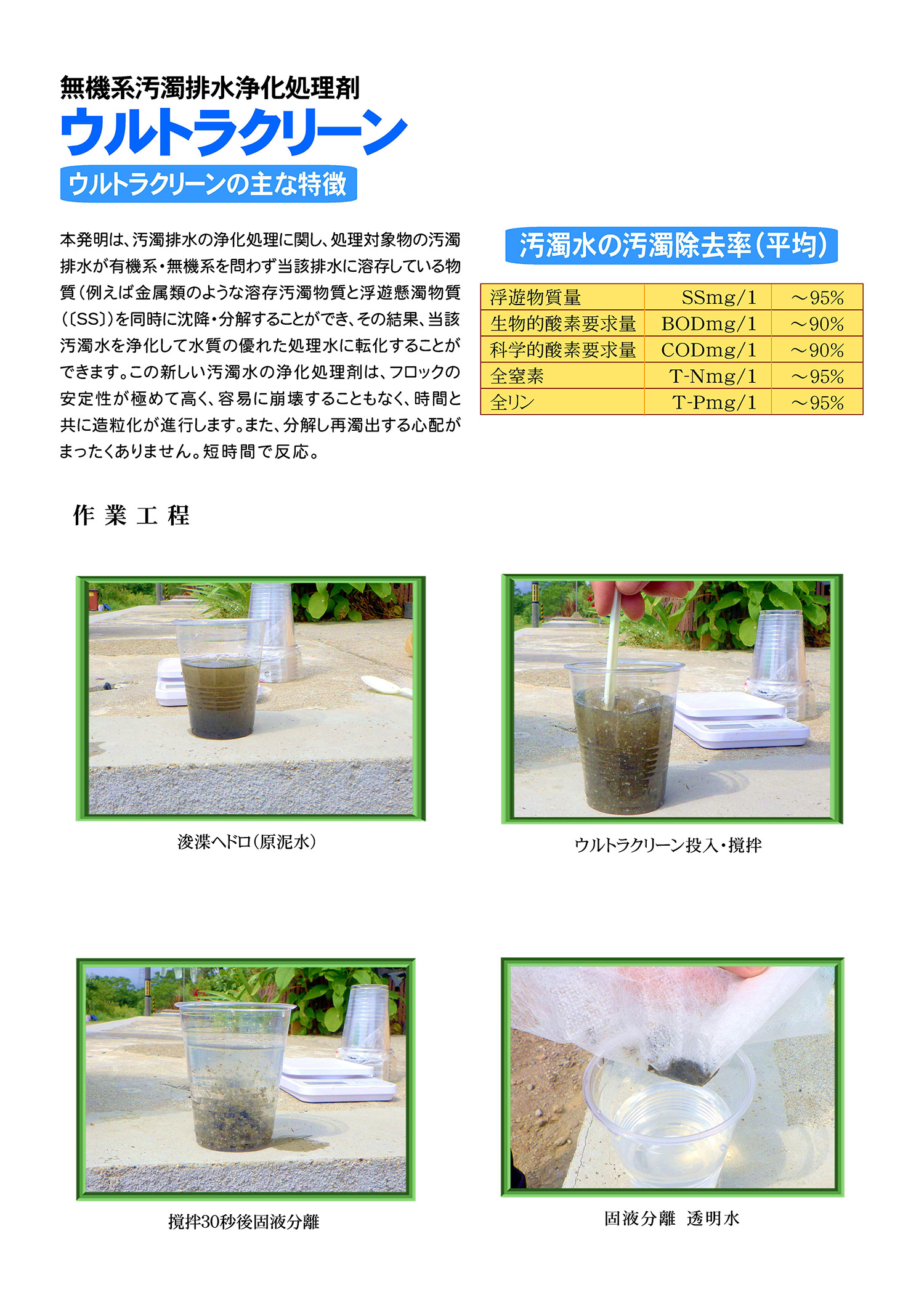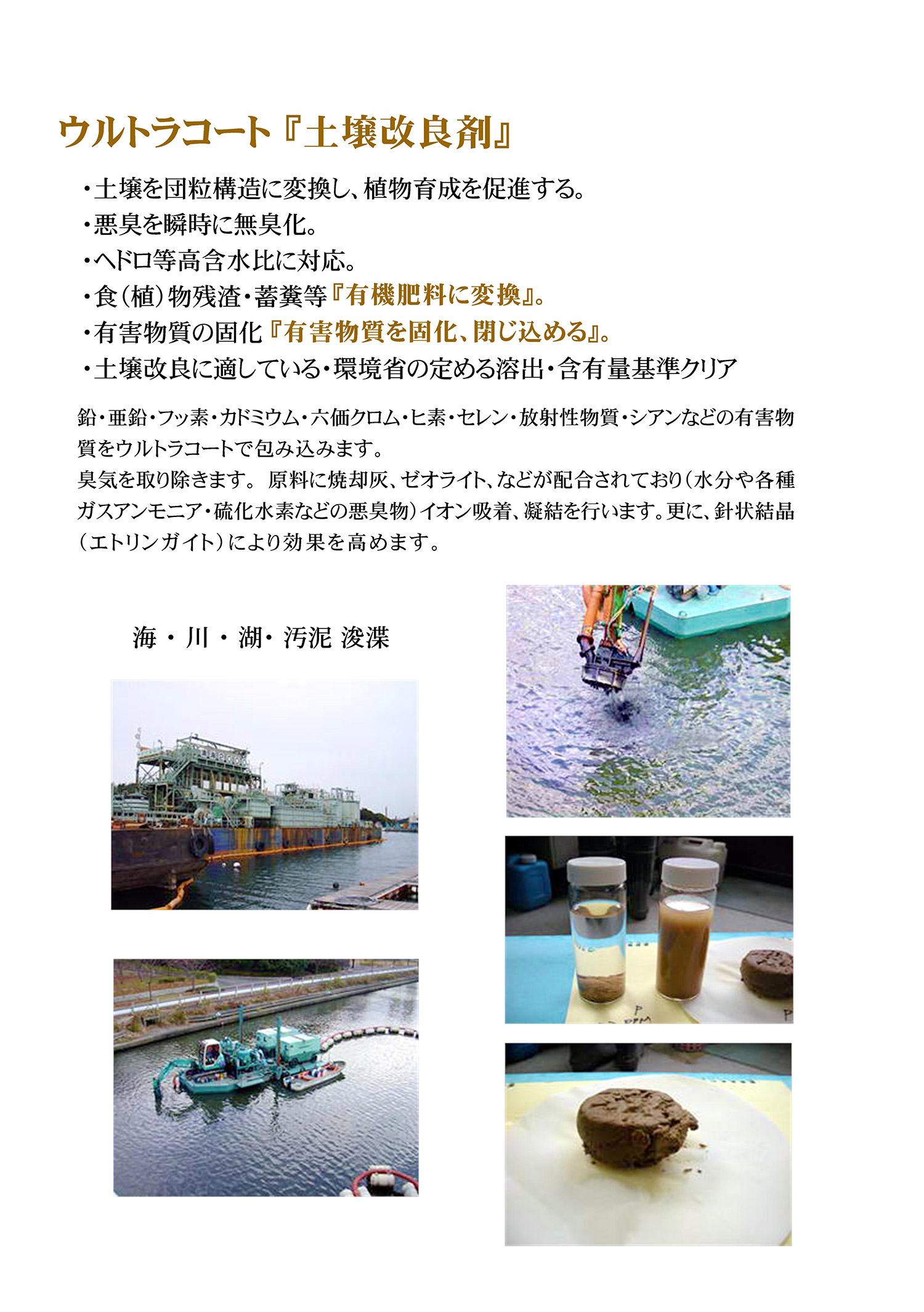 - 無機系汚濁排水処理剤(ウルトラクリーン)土壌団粒固化剤(ウルトラコート)強度固化剤(オプスコン)研究開発・製造・販売