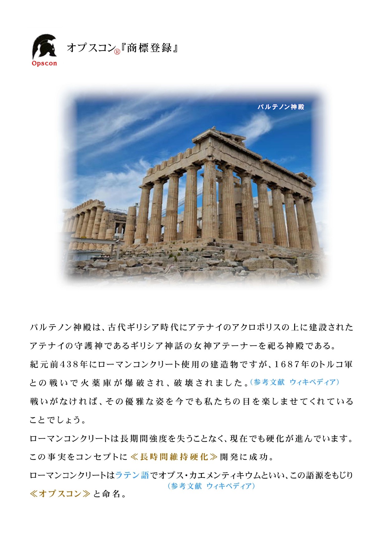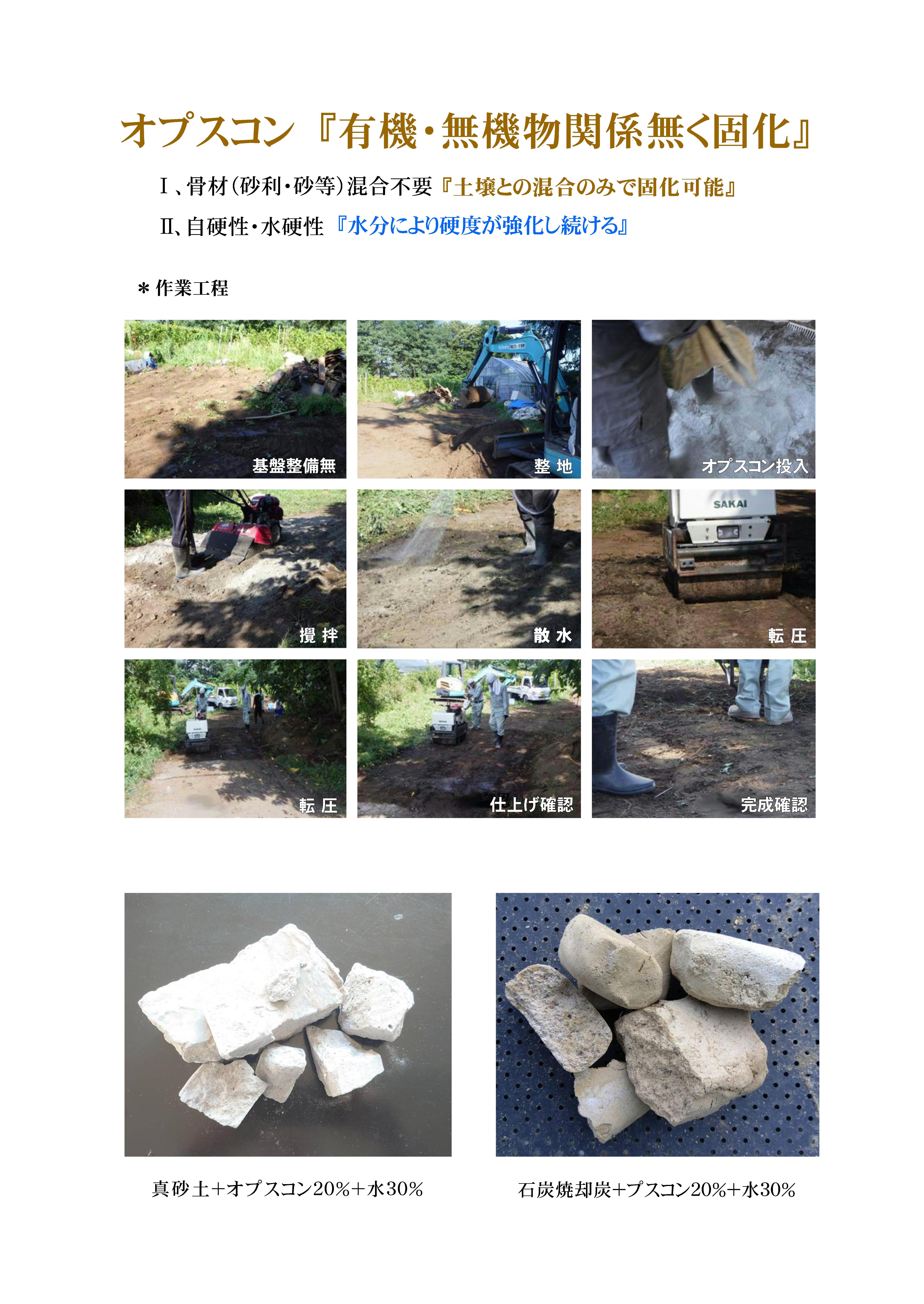 - 国土交通省のNETIS(ネティス:(新技術情報提供システム)のNETIS登録番号:TH-250017-A 技術名称:天然植物及び鉱物性由来セメント系固化材「オプスコン」としてNETISに登録されました。